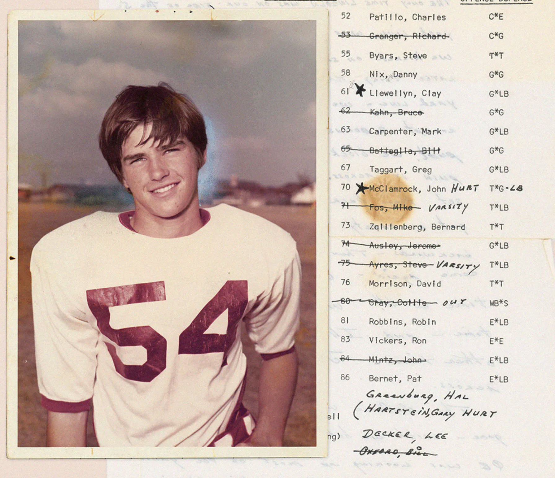 John McClamrock, wearing his Hillcrest Panthers uniform. His team’s game-day roster, which listed John as “hurt.” (Courtesy of texasmontly.com)